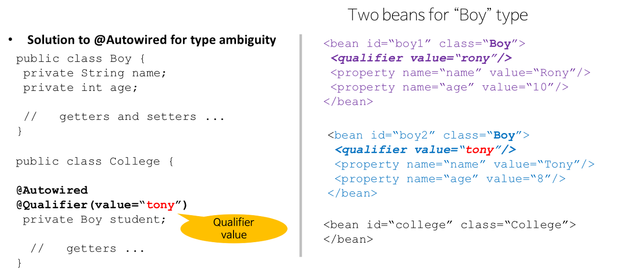 필드, 생성자, 입력 파라미터가 여러 개인 메소드(@Qualifier는 메소드의 파라미터)에 적용 가능하다.
