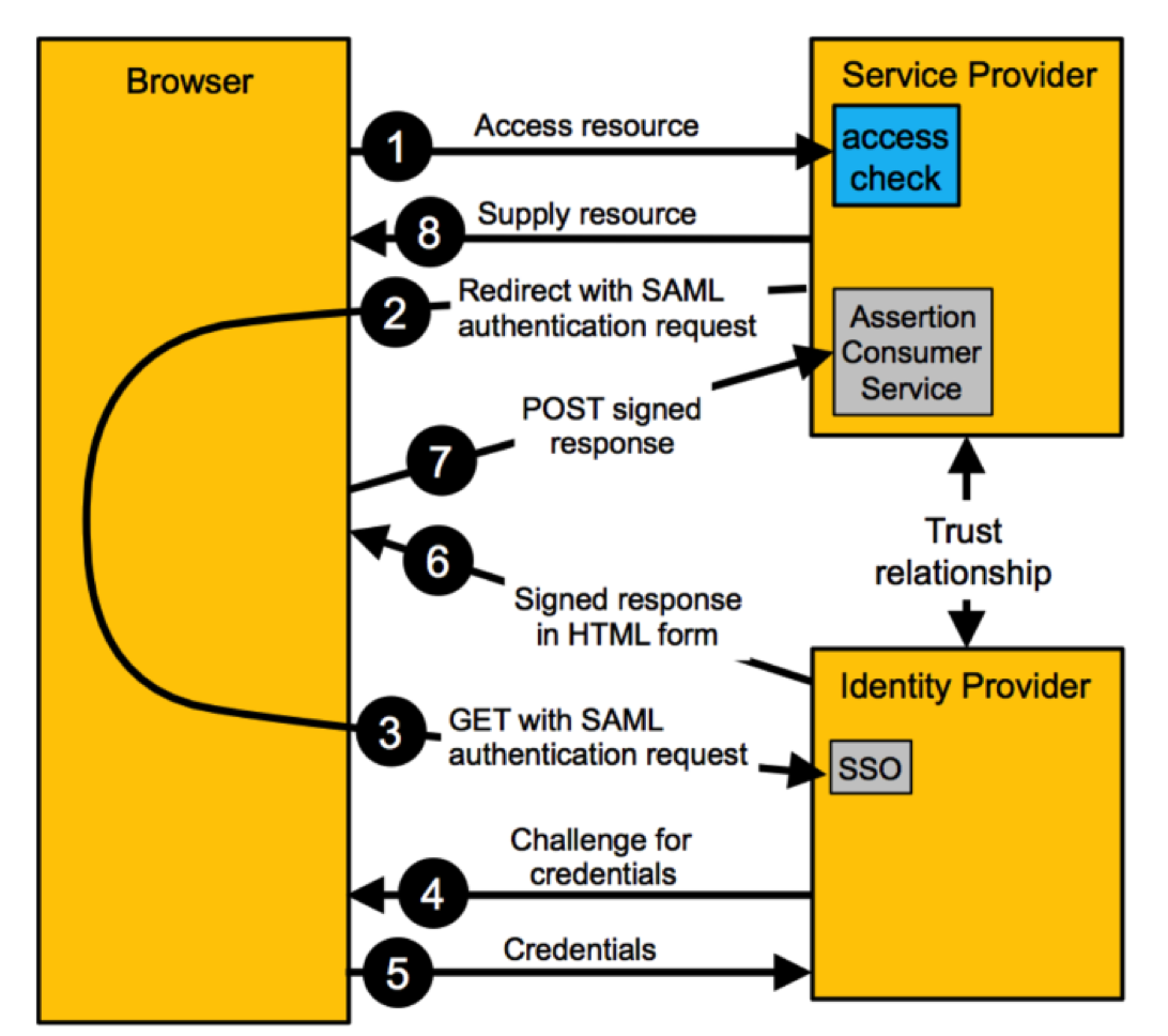 주체는 서비스를 서비스 제공자로부터 요청한다. 이 서비스 제공자(SP)는 식별 어서션(assertion)을 인증 정보 제공자(IdP)로부터 요청하여 가져온다. 이 어서션(assertion)에 기초하여, 서비스 제공자(SP)는 접근을 제어한다. 즉, 연결된 주체에 대해 일부 서비스를 수행할지의 여부를 결정할 수 있다.