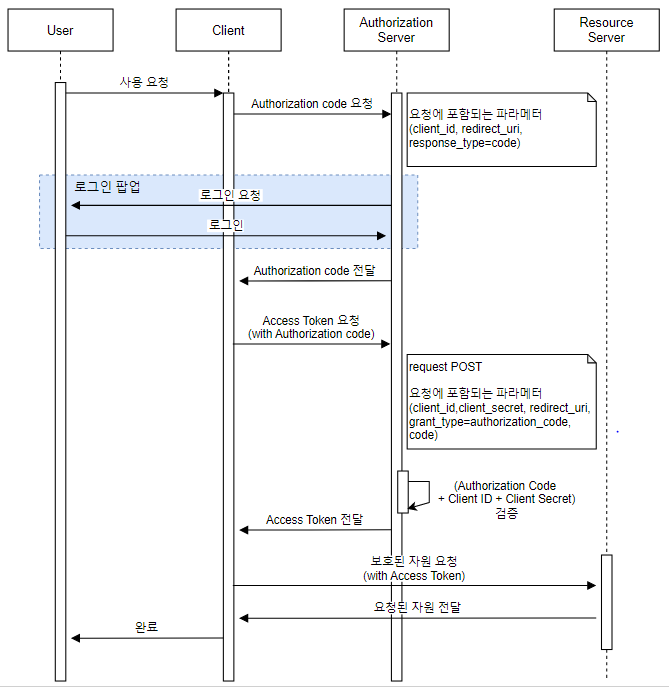 - Client Id와 Redirect Uri를 전달하여 로그인 인증을 요청하고, 로그인을 완료하면 Authorization Code를 발급받는다