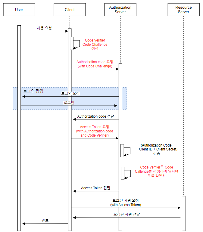 단계적으로 Code Verifier와 Code Challenge를 교환하고 Authorization 서버에서는 이를 검증함으로써 Authorization code의 요청자와 AccessToken의 요청자가 서로일치하고 Authorization code가 외부인에게 노출되지 않았음을 검증합니다.