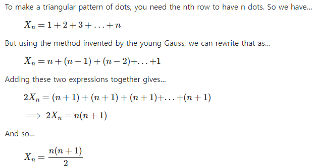 - 연속된 숫자의 값이 1 + 2 + 3... 형식으로 더해진다는 것에 착안하여, N * (N + 1) / 2 공식을 활용한 것
