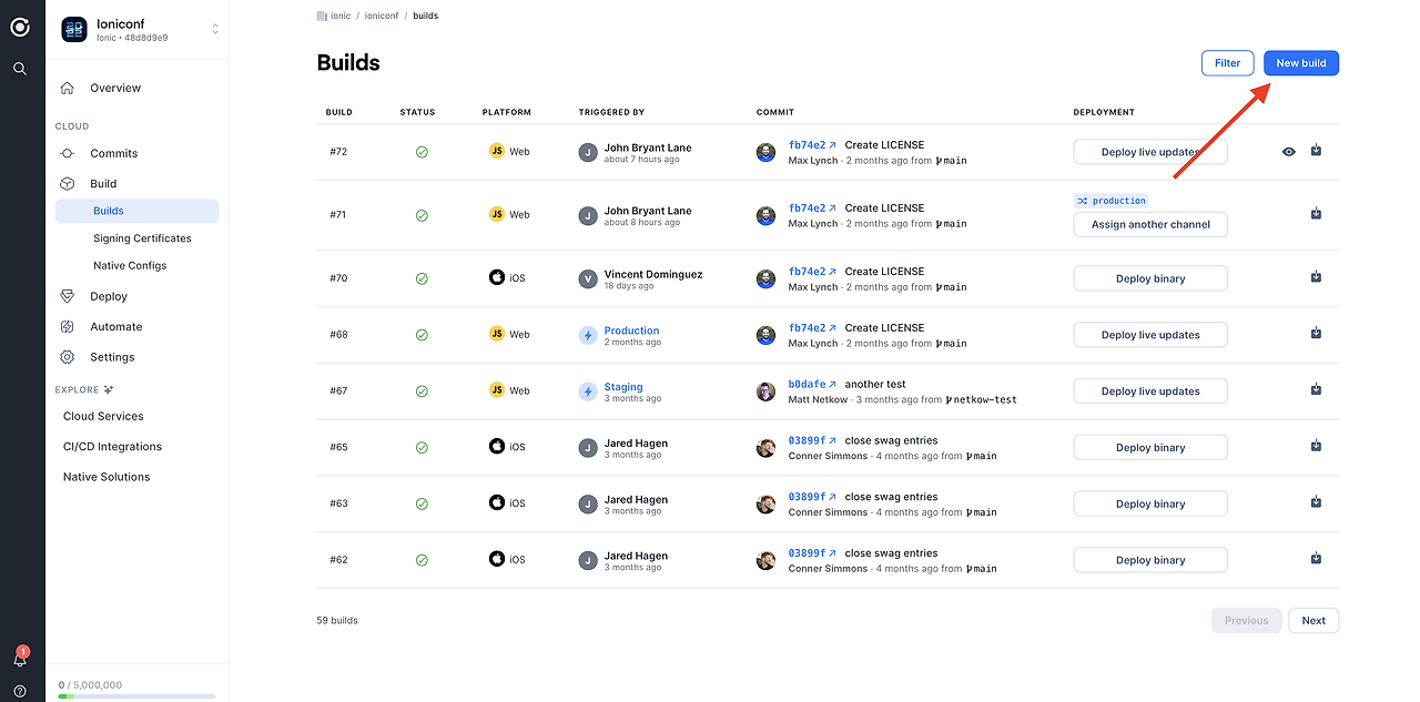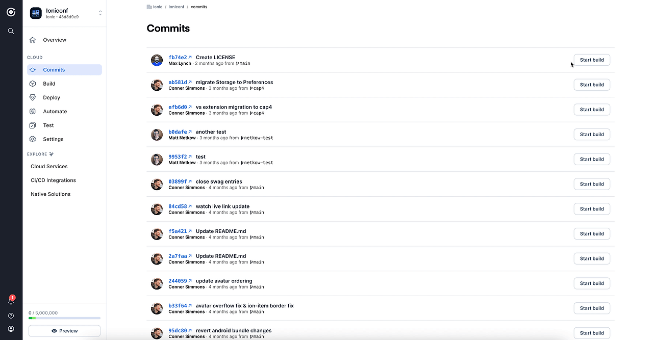 Appflow 대시보드 "Build"란에서 수동으로 Commit을 선택하여, Build를 진행(Web)합니다.