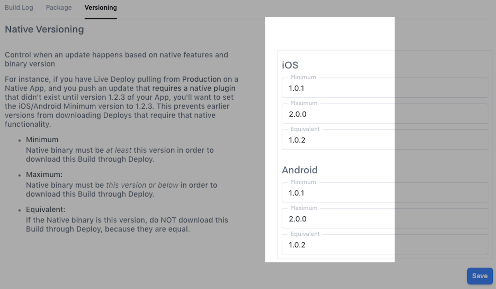 - 동등: 네이티브 바이너리가 이 버전인 경우 이 라이브 업데이트를 다운로드 하지 마십시오 . 왜냐하면 동일하기 때문입니다.
