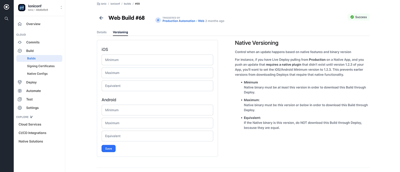 "Build" 탭에서, 완료된 빌드 상세 화면으로 진입 시, "Versioning" 탭에서 버전관련 설정을 해준다.