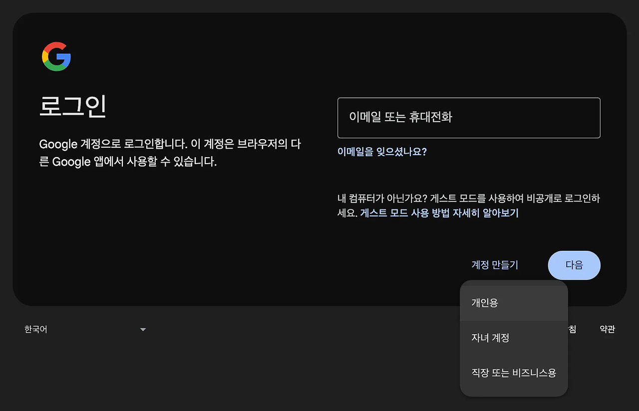 계정 만들기 버튼을 통해 [개인용] 구글 계정을 만들고 새로운 Gmail 주소를 만들어주세요.