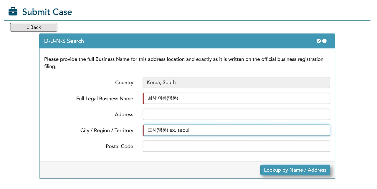 [Full Legal Business Name] 에는 회사 이름을 영문으로, [City / Region / Territory] 에는 도시 이름을 영문으로 입력하고 Lookup by Name / Address 버튼을 눌러주세요.
