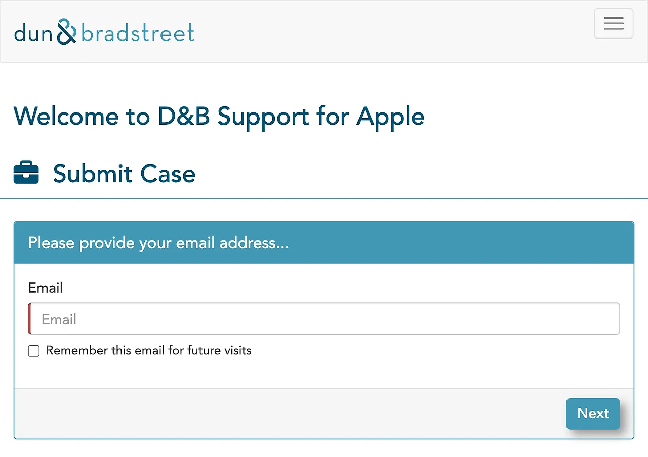 👉🏼 https://support.dnb.com/?CUST=APPLEDEV