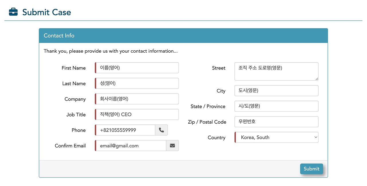 이름과 조직에 대한 정보를 모두 영문으로 입력한 후 Submit 버튼을 눌러주세요.