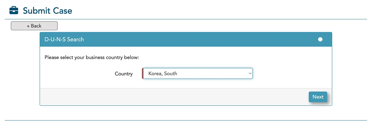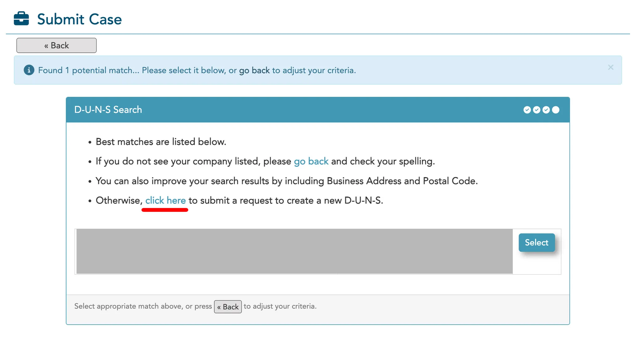 조회되는 D-U-N-S 정보가 있다면 Select 버튼을 선택하고, 없다면 click here 버튼을 선택합니다.