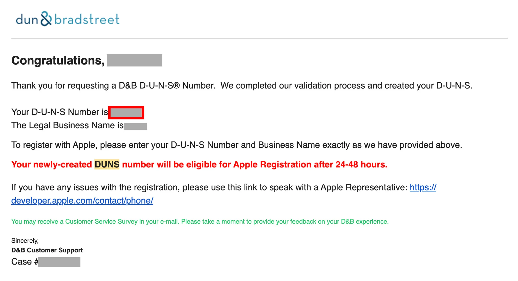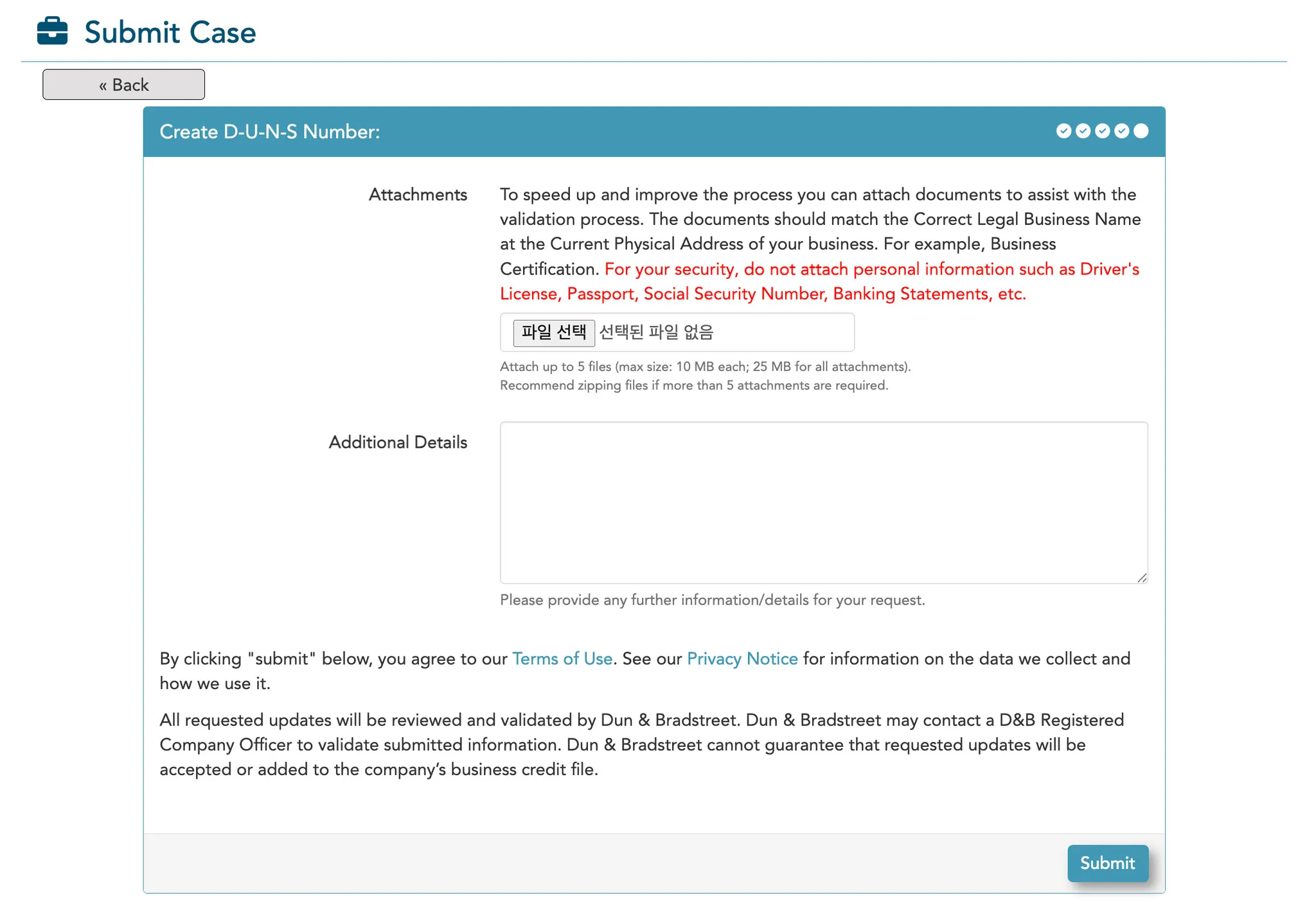 D-U-N-S 번호는 30일까지 소요될 수 있으나 보통은 수일 이내에 처리되어 이메일로 전달됩니다.