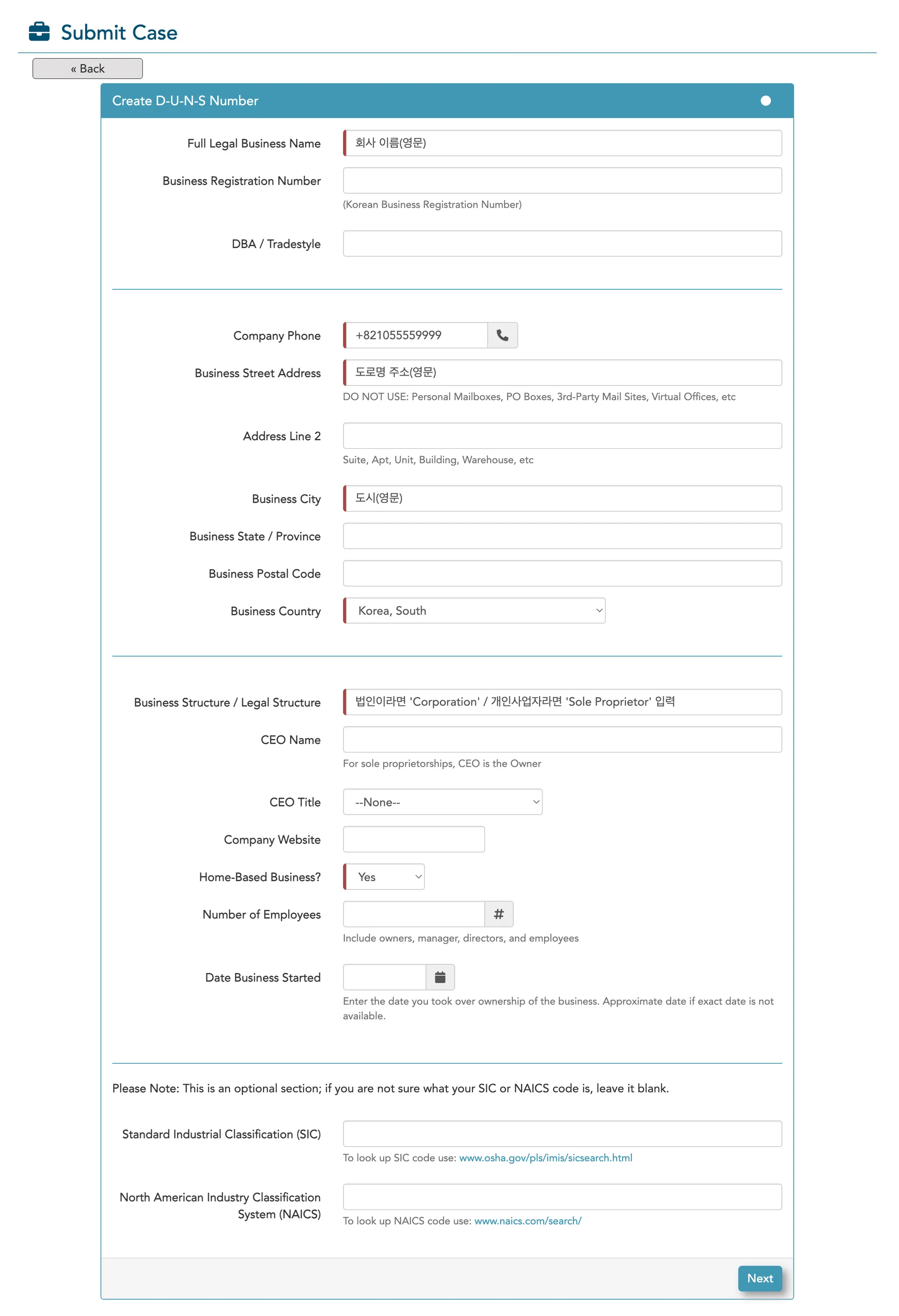 사업자 정보를 모두 입력했다면 Next 버튼을 눌러주세요.