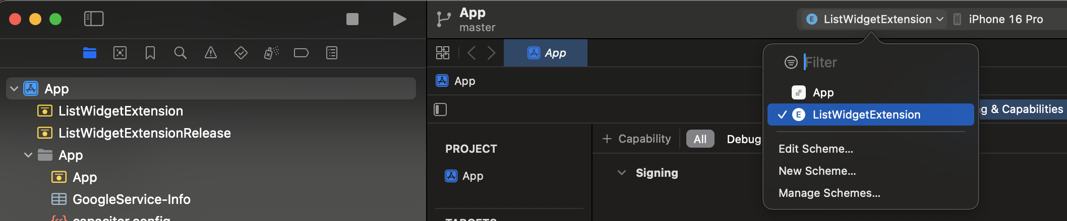 1. Xcode 상에서 Target을 "App"이 아니라 "Widget"으로 지정 (Target 기기는 자주 사용하는 Simulator 기종으로 변경)