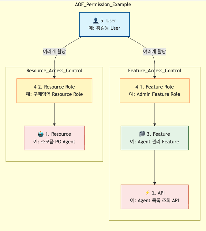 FR["4-1. Feature Role<br>예: Admin Feature Role"] --> F["📁 3. Feature<br>예: Agent 관리 Feature"] --> A["⚡ 2. API<br>예: Agent 목록 조회 API"]