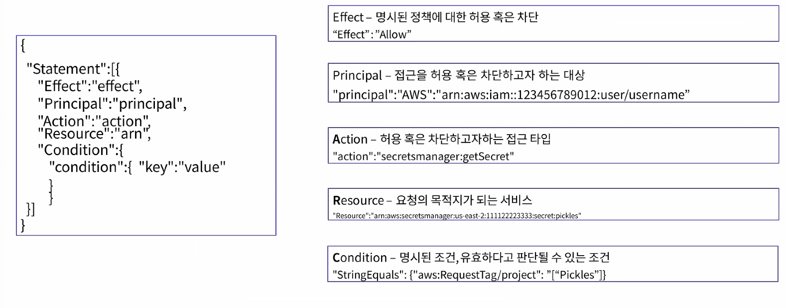 2. 리소스 기반 정책 (S3 버킷과 같은 리소스에 연결하는 JSON 정책 문서, 지정된 보안 주체에 해당 리소스에 대한 특정 작업을 수행할 수 있는 조건 정의 및 권한 부여, 리소스 기반 정책은 인라인 정책 - 리소스 관점이다! 리소스에 부여하는 정책이다.)