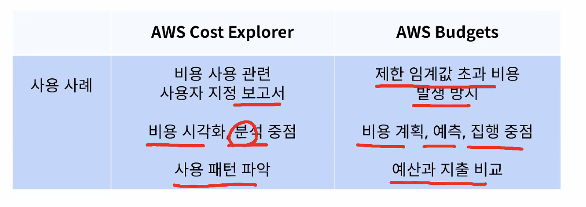 - 사용자 지정 예산을 설정하여 비용 & 사용량을 추적하고, 임계값 초과 시 이메일 또는 SNS 알림에서 수신된 알림에 빠르게 대응 가능