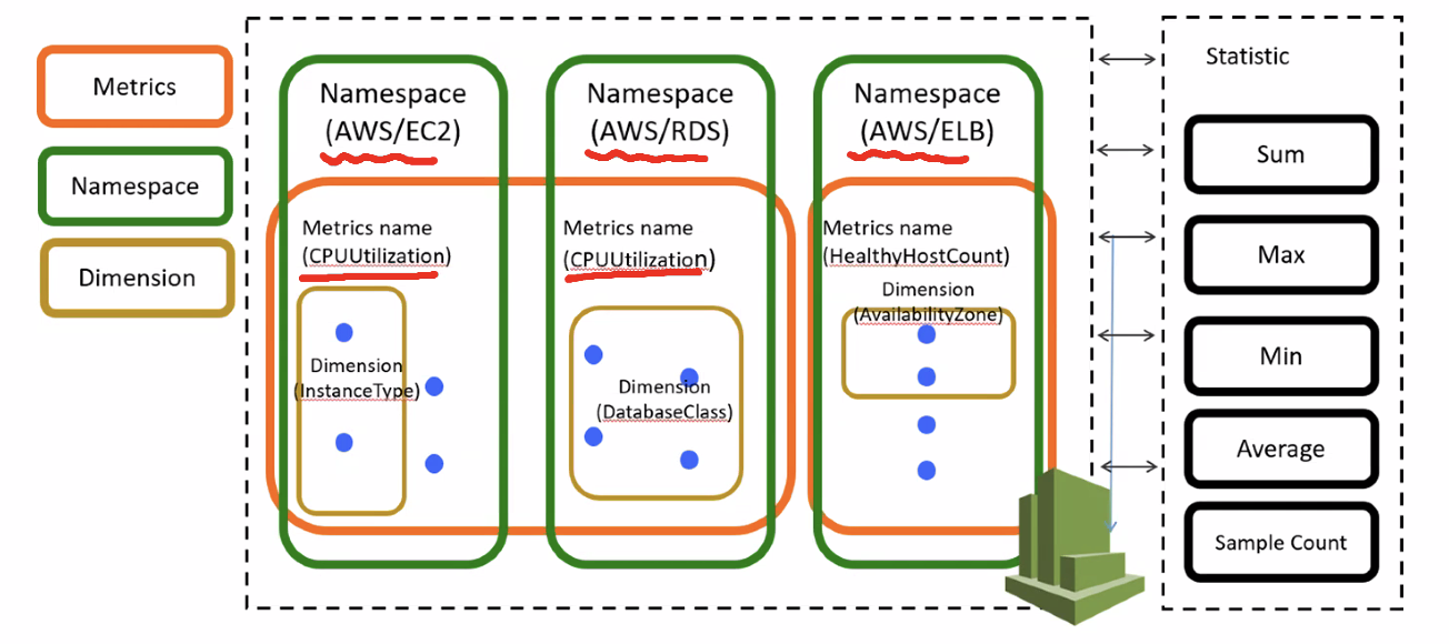 어떤 서비스에서 발생한 지표인지 알아야 하므로, Cloud Watch에서는 서비스 네임스페이스를 보고 어떤 서비스에서 발생한 지표인지 알 수 있다.
